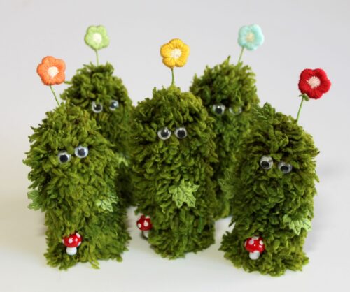 Das Moosmännchen mit Blume und Fliegenpilz ist aus fluschigem Textilgewebe, passt auf jeden Finger und liebt Laub.